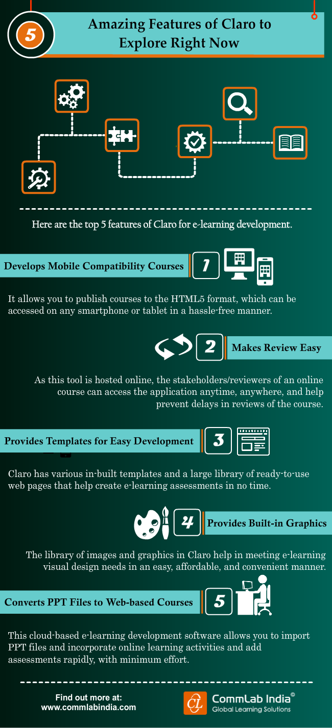 Of the many authoring tools available today, Claro is one of the most popular cloud-based authoring tools. This powerful authoring tool has many built-in features and advantages which help people work together on the same project and share learning resources. It also allows stakeholders to review course content online and provide feedback instantly, thereby reducing course development time.