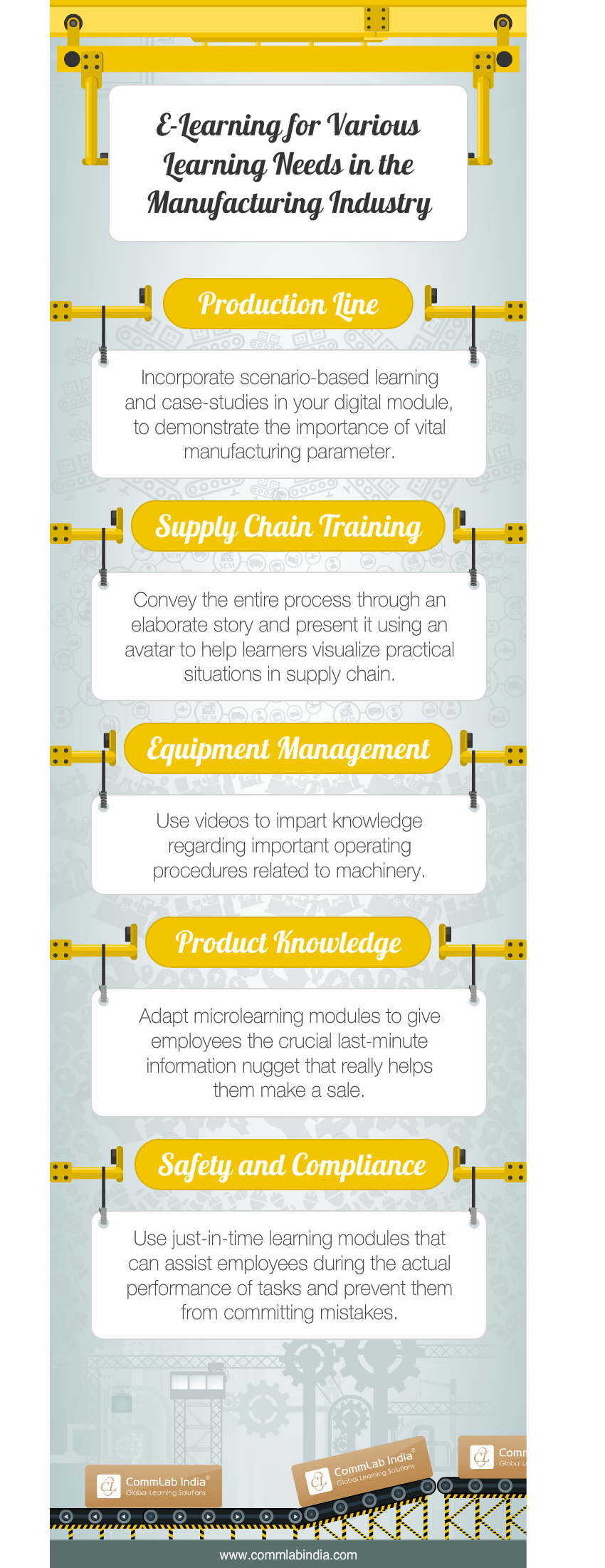 Well, e-learning can easily take over your manufacturing learning needs. It helps your workforce learn with ease anytime, anywhere, and saves a lot of training costs. Check our infographic to know how every aspect of manufacturing can be handled through e-learning.