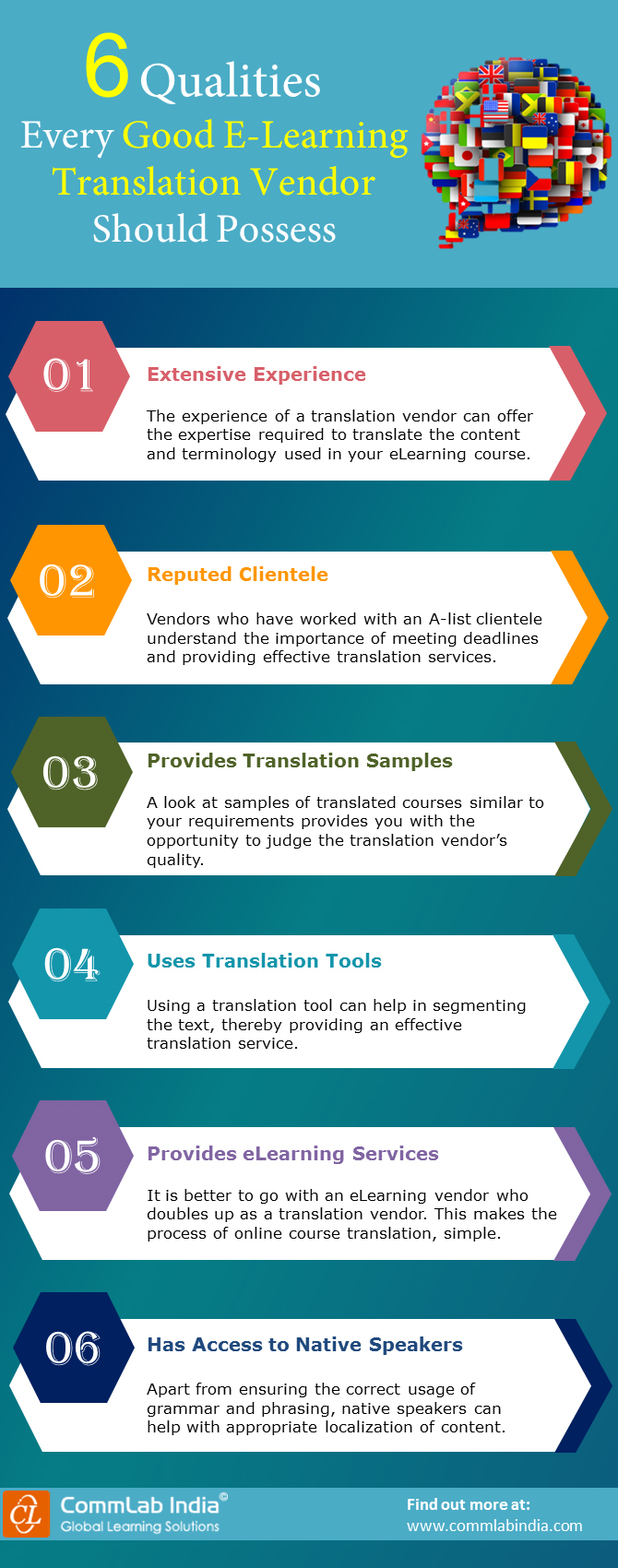 Check this infographic to know the qualities a good e-learning translation vendor must possess, to narrow down your search.