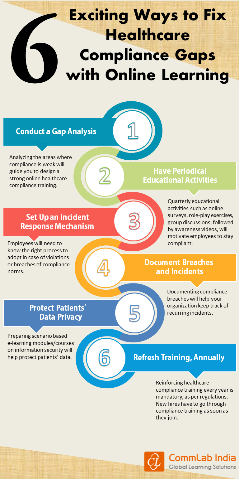 We have 6 exciting ways to fix healthcare compliance gaps with online learning. Check our infographic to know more.