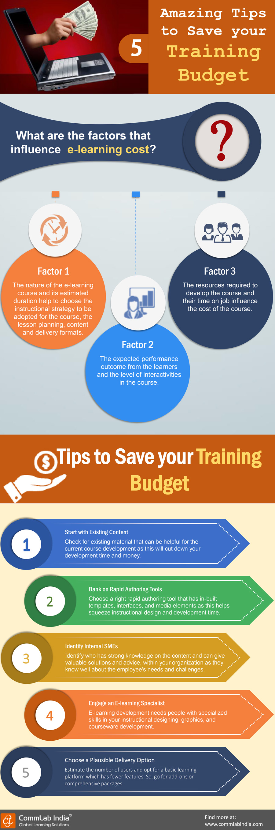 Here’s our infographic to know about the factors that influence the cost of e-learning course development and the amazing tips to save your budget on training.