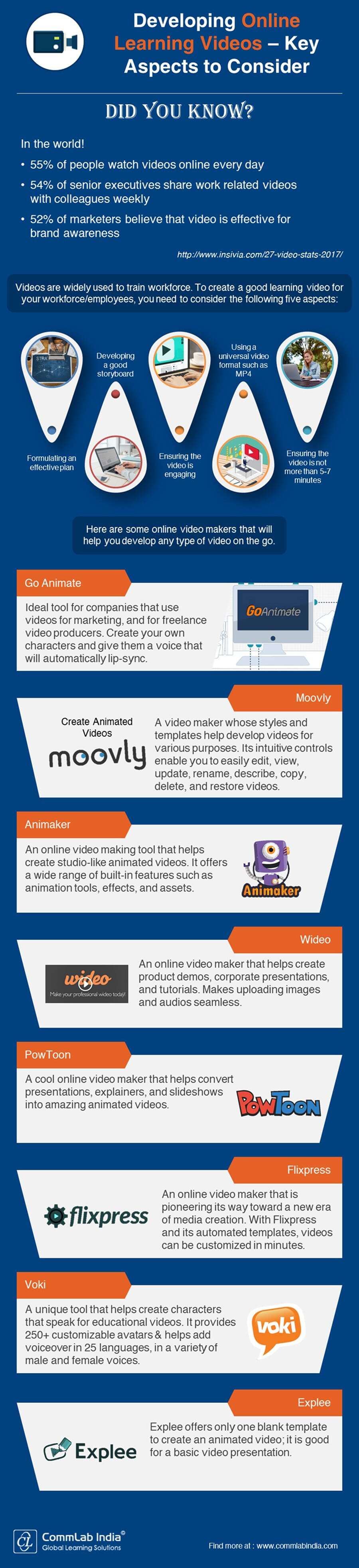 Check this infographic to know the key aspects you should consider while developing videos and also some of the popular video makers that can be used to develop amazing learning videos.