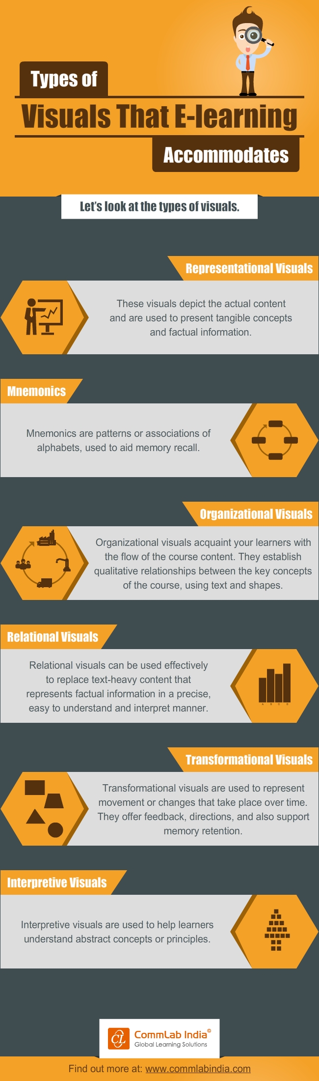 Here is an infographic on the types of visuals e-learning accommodates. Please check it out.
